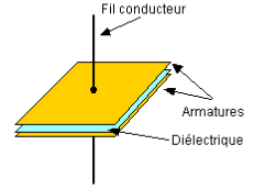 Un condensateur est un composant électronique capable de stocker de l’énergie sous la forme d’un champ électrostatique. Il est constitué de 2 armatures séparées par un isolant, le ”diélectrique”.