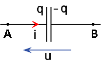 Soit iAB l’intensité algébrique du courant allant de A vers B et qA la charge qui apparaît sur la plaque par laquelle on entre dans le condensateur.