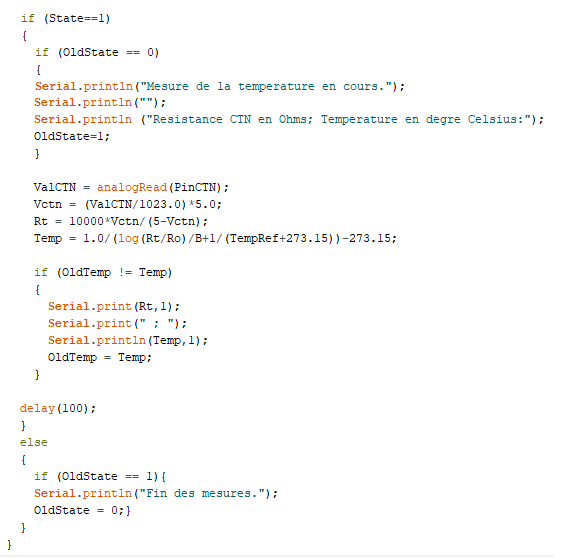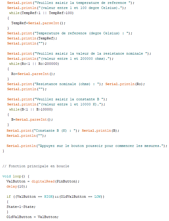 Le code demande, à l’initialisation du programme, de renseigner les valeurs de T0, R0 et β afin de pouvoir calculer la température à partir de la mesure de la résistance de la CTN.