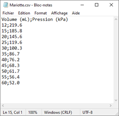 Pour exploiter les mesures, on peut dans un premier temps, copier/coller les résultats dans un fichier « csv » créé avec le bloc-notes de Windows, comme ci-dessous :