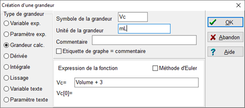 Pour cela, on va créer une grandeur, appelée Vc en mL, pour volume corrigé :