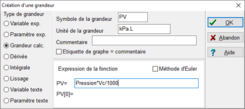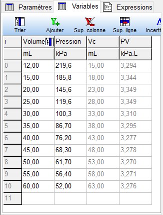 Puis on crée une grandeur, appelée PV, de façon à déterminer la valeur de la constante de la loi de Boyle-Mariotte (en kPa.L) :