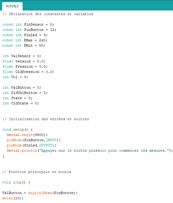 . float Pression = 0.0 (variable nombre décimal pour stocker le résultat du calcul de la pression)