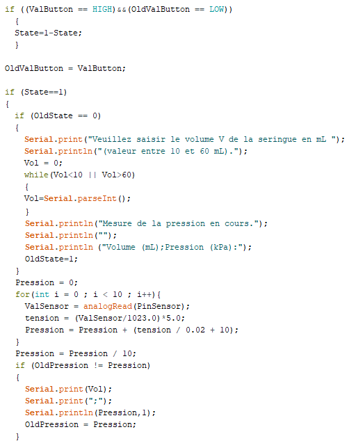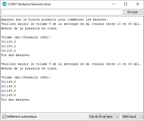 La pression est ensuite mesurée par le capteur qui délivre une tension électrique proportionnelle à la pression. Une moyenne est réalisée sur dix mesures et le résultat de la pression moyenne (p en kPa) pour le volume (V en mL) est affiché dans le moniteur série.
