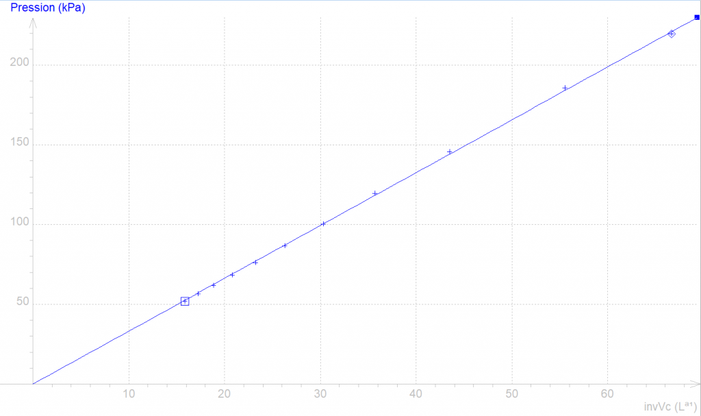 On retrouve bien la valeur de la constante de la loi de Boyle-Mariotte d’environ 3,3 kPa.L approximée précédemment.