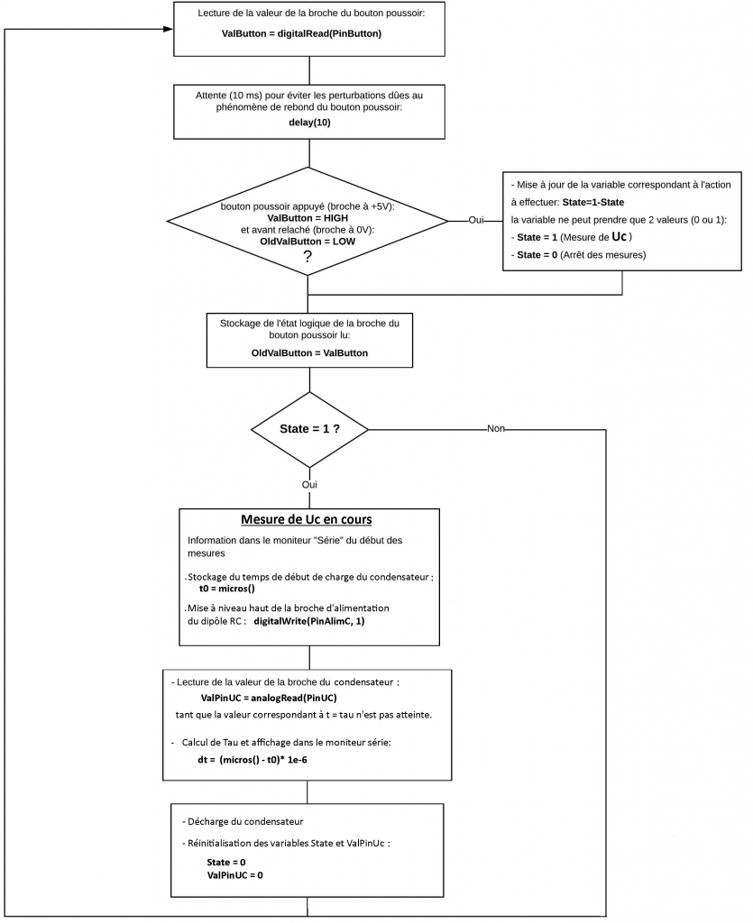 Ainsi, après avoir déchargé le condensateur, la mesure de la tension aux bornes du condensateur Uc, lors de la charge, à l’aide de l’entrée analogique A0 est lancée, à t = 0 s, par un appui sur le bouton poussoir.