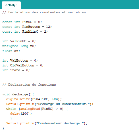 . int ValPinUc = 0 (variable nombre entier pour stocker la valeur de la broche du condensateur)