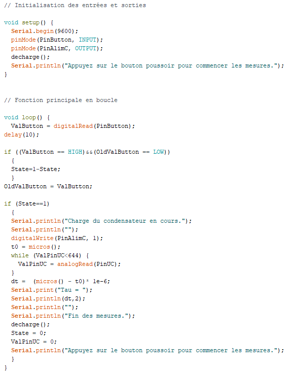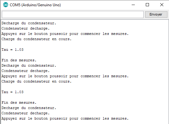 Quand la valeur de l’entrée analogique A0 souhaitée est atteinte, la constante de temps est alors calculée et affichée dans le moniteur série, puis le condensateur est déchargé.