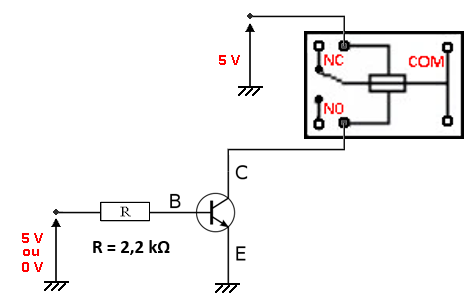 Il faut donc ajouter un circuit de contrôle à notre relais pour commuter de la position NC à NO. Pour cela, nous allons utiliser un transistor bipolaire NPN (BC547B) en mode interrupteur commandé avec le circuit suivant :