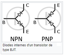 On peut considérer, à quelques détails près, qu’un transistor est composé de deux diodes mises en série dans des sens opposés :