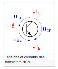 Il existe une tension entre chaque paire de broche, ainsi qu’un courant qui passe dans chaque broche. Cela fait en tout trois tensions notées VCE, VCB, VBE et trois courants notés IC, IB et IE.