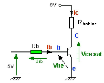 Dans notre circuit de contrôle du relais, la résistance Rb utilisée étant de 2,2 kΩ, le courant ib est alors d’environ 2 mA.