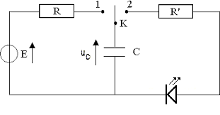 Dans ce circuit, quand l’interrupteur est en position 1, le condensateur se charge à travers la résistance R et quand l’interrupteur est en position 2, le condensateur se décharge dans la résistance R’ et la DEL.