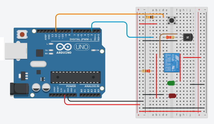 Le circuit suivant permet d’allumer la DEL rouge ou la DEL verte avec un bouton poussoir et le programme de contrôle d’un relais :