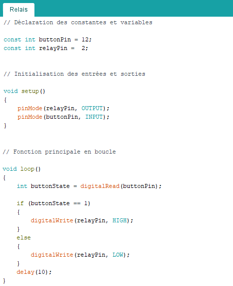 – bouton appuyé (buttonState =1) : broche du relais à HIGH