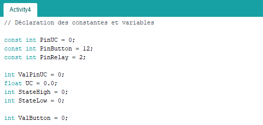 . int ValButton = 0 (variable nombre entier pour stocker la valeur de la broche du bouton poussoir)