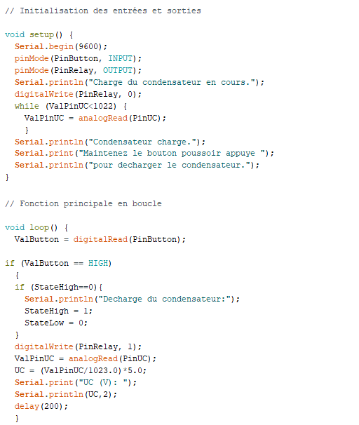. float Uc = 0.0 (variable nombre décimal pour stocker le résultat du calcul de la tension Uc)