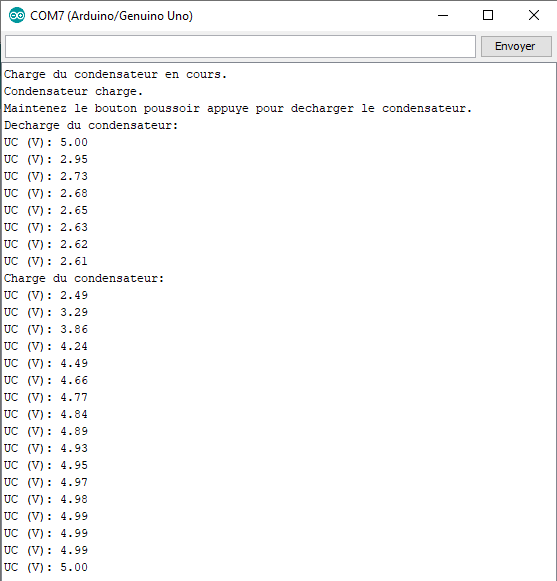 On peut voir, dans le moniteur série, que le condensateur se décharge jusqu’à atteindre la tension de seuil de la DEL blanche (environ 2,5 V).