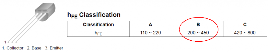 D’après la documentation du constructeur du transistor BC547B, β est au moins égal à 200 :