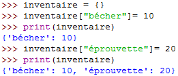 – Pour ajouter des données à un dictionnaire il faut donc indiquer une clé ainsi qu’une valeur :