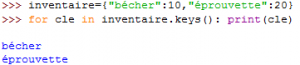 – A l’aide d’une boucle for et de la méthode keys(), on peut récupérer les clés d’un dictionnaire :