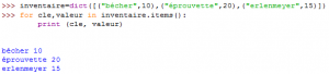 – et pour récupérer les clés et les valeurs en même temps, on utilise la méthode items() qui retourne un tuple :
