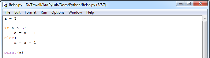 Dans cet exemple, le programme va tester si la variable uneVariable est supérieure à 50. Si c’est le cas, le programme va réaliser une action particulière. Autrement dit, si l’état du test est vrai, le bloc d’instructions (ligne d’instructions de même indentation) après le caractère ”:” est exécuté.