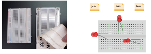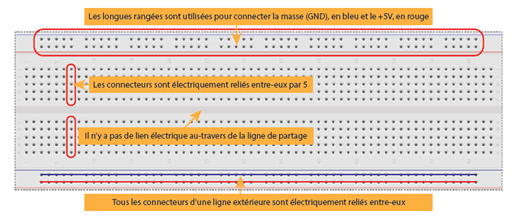 Tous les connecteurs dans une rangée de 5 sont reliés entre eux. Donc si on branche deux éléments dans un groupe de cinq connecteurs, ils seront reliés entre eux. Il en est de même des alignements de connecteurs rouges (pour l’alimentation) et bleus (pour la terre).
