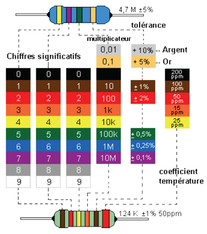 La valeur de la résistance se mesure en Ohms (Ω). La valeur d’une résistance est déterminée par ses bandes de couleurs :