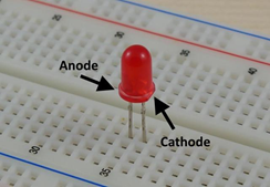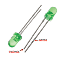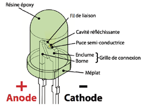On reconnaît l’anode, car il s’agit de la broche la plus longue. Lorsque les deux broches sont de même longueur, on peut distinguer l’anode de la cathode, par un méplat du côté de cette dernière.