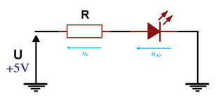 Pour calculer la valeur de la résistance adéquate qu’il faut utiliser, on doit appliquer la loi d’Ohm au circuit suivant :