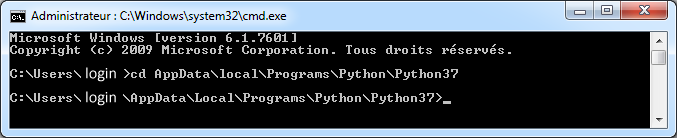 Pour ajouter une bibliothèque à Python sous Windows, le plus simple est d’ouvrir une console de commandes (taper cmd dans la zone de recherche de Windows) et de se placer dans le dossier d’installation de Python :