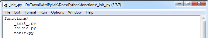 Ces deux modules ainsi que le fichier _init_.py sont situés dans un dossier nommé fonctions. Dans ce cas simple, le fichier _init_.py peut être vide, mais il peut également décrire l’arborescence du dossier fonctions :