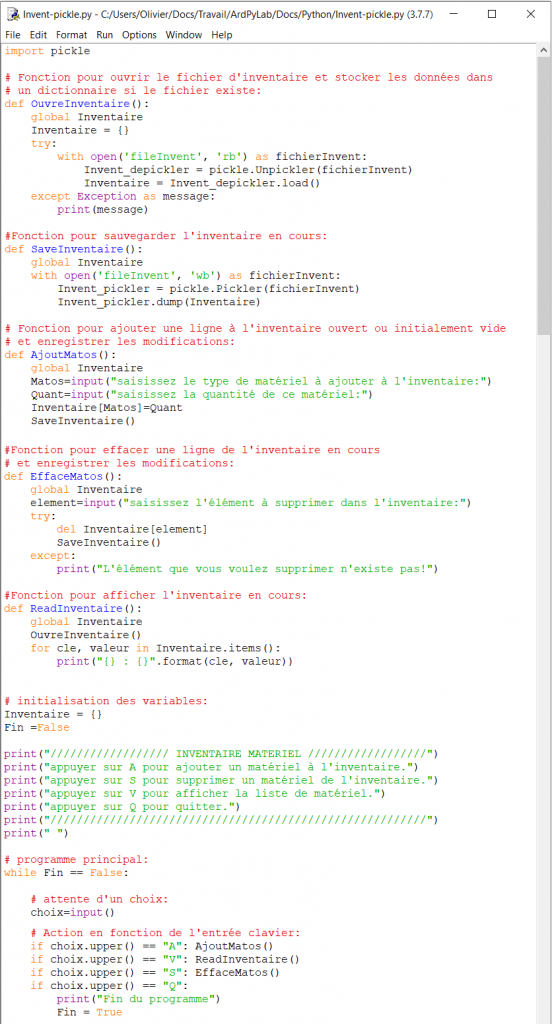 Dans le script suivant, des fonctions d’ouverture et de sauvegarde au format binaire d’un dictionnaire nommé inventaire sont définies et utilisées pour afficher l’inventaire et enregistrer les modifications qui lui sont apportées (ajout ou suppression de lignes).