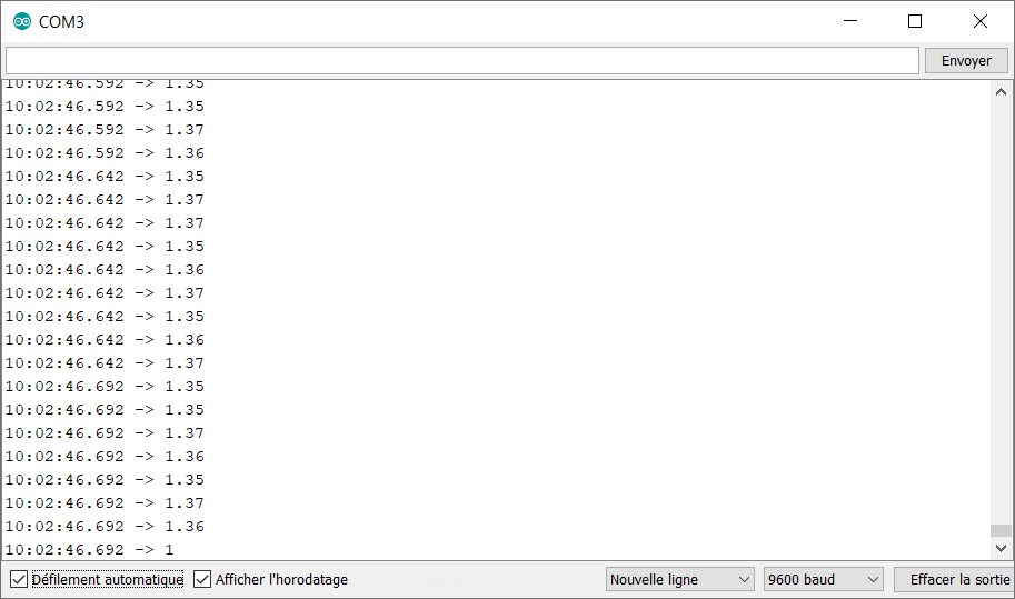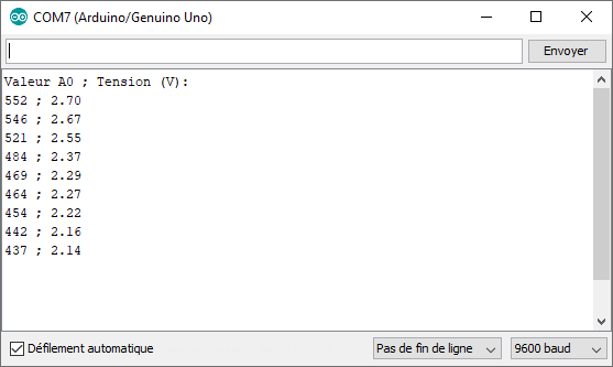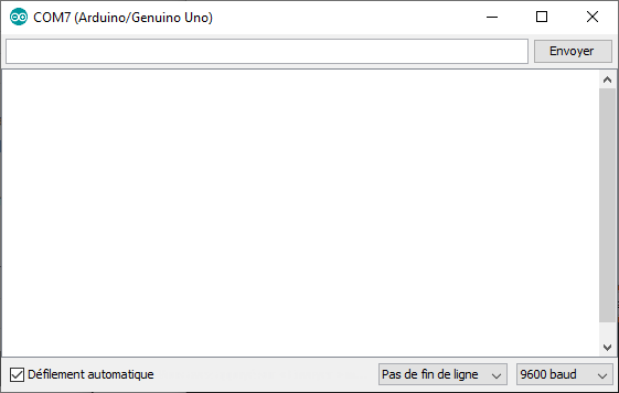 – la case cochée « Défilement automatique » permet d’arrêter le défilement des données retournées par l’Arduino si on la décoche,