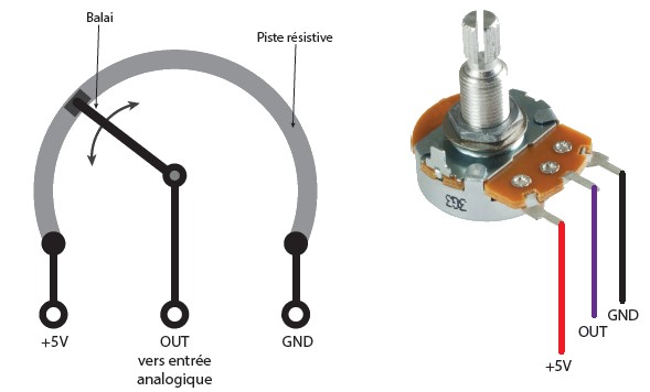 Vs, qui est la tension appliquée sur une entrée analogique de l’Arduino, varie donc entre 0 et +5V en fonction de la position du curseur du potentiomètre.