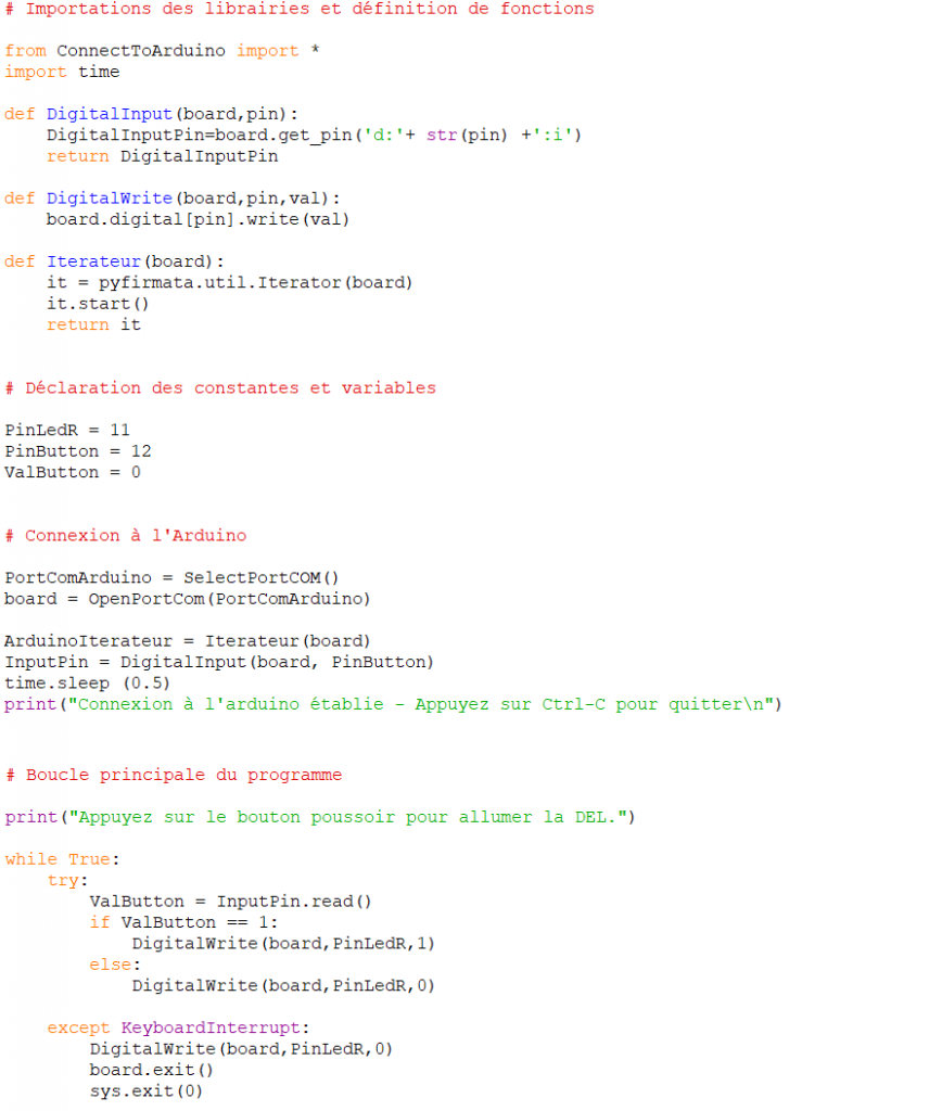 Le programme suivant (nommé ”LedRVBDigitalInput.py”) permet d’allumer la DEL rouge quand le bouton poussoir est appuyé et de l’éteindre quand celui-ci est relâché :
