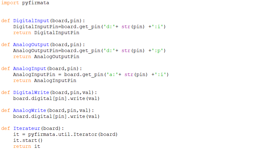 . Toutes les fonctions utiles à l’utilisation de ”PyFirmata” (fonction de déclaration des entrées et sorties, d’itérateur, d’écritures…) que nous avons définies jusqu’à présent ont été regroupées dans un fichier Python, nommé ”PyFirmataDef.Py” que l’on peut importer dans tous les programmes, à condition que le fichier des fonctions soit dans le même dossier que le fichier du programme, avec l’instruction :