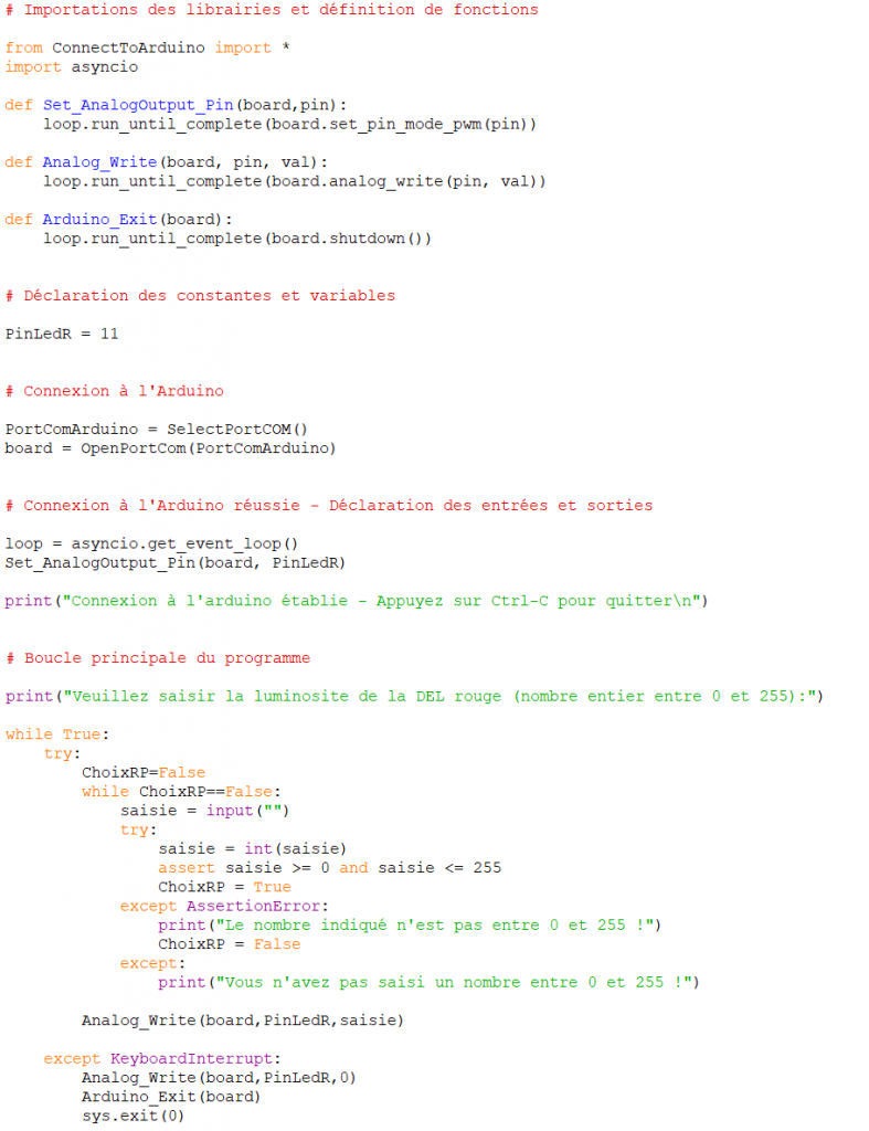 Le programme (”LedRVBAnalogOutput.py”) va demander à l’utilisateur de saisir un nombre entier entre 0 et 255 de façon à régler la tension de la broche sur laquelle la DEL rouge est connectée entre 0 et 5 V.