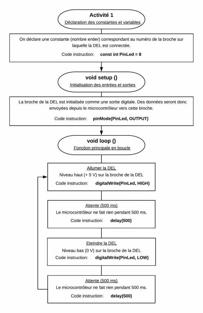 Le code en Python ou en langage Arduino pourra être modifié pour voir l’influence des variables (durée d’allumage, d’extinction, numéro de la broche de la DEL).