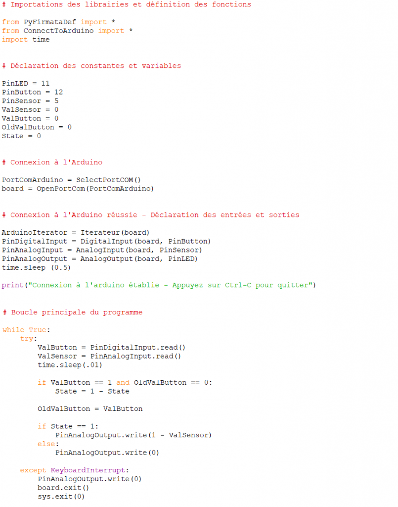 . Le module ”ConnectToArduino.py”, contenant les fonctions de connexion à l’Arduino via le protocole ”Firmata standard”,