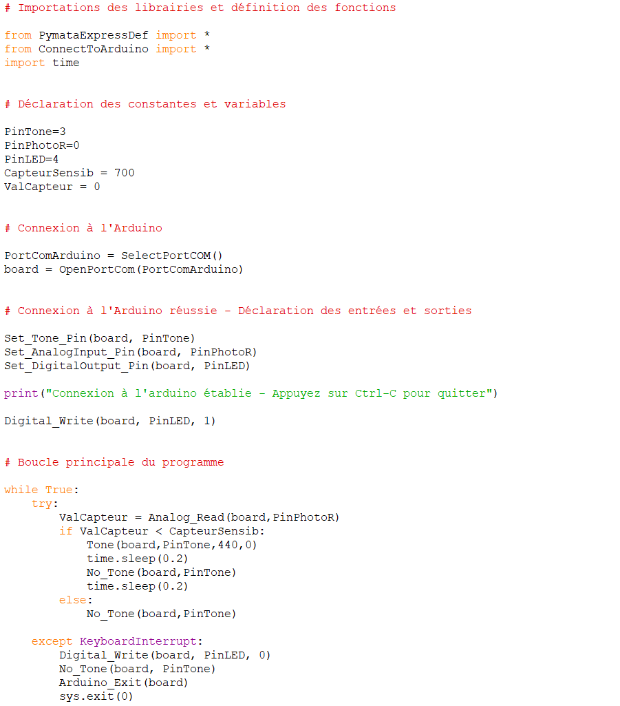 En présence d’un obstacle entre la DEL et la photorésistance, la tension mesurée au niveau de la broche A0 diminue et quand celle-ci est inférieure à un seuil (la sensibilité du capteur définie initialement), l’alarme sonore est déclenchée.