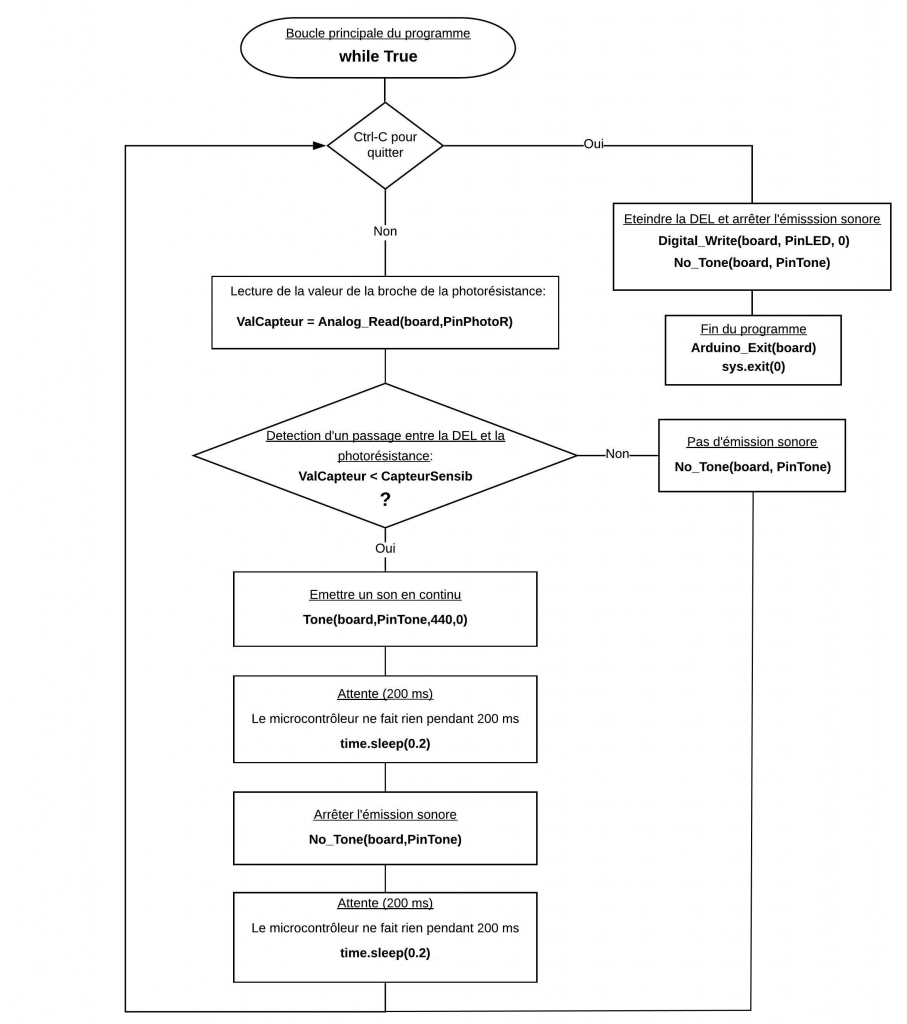 Boucle principale du programme (boucle ”while True”) :