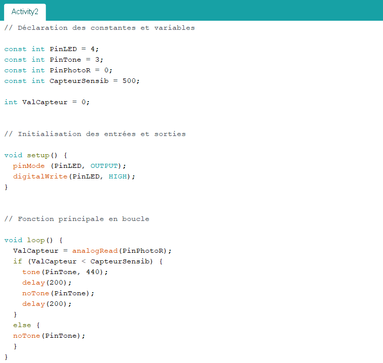 . Programme en langage Arduino (”Projet3/Activity2/INO/Activity2.ino)