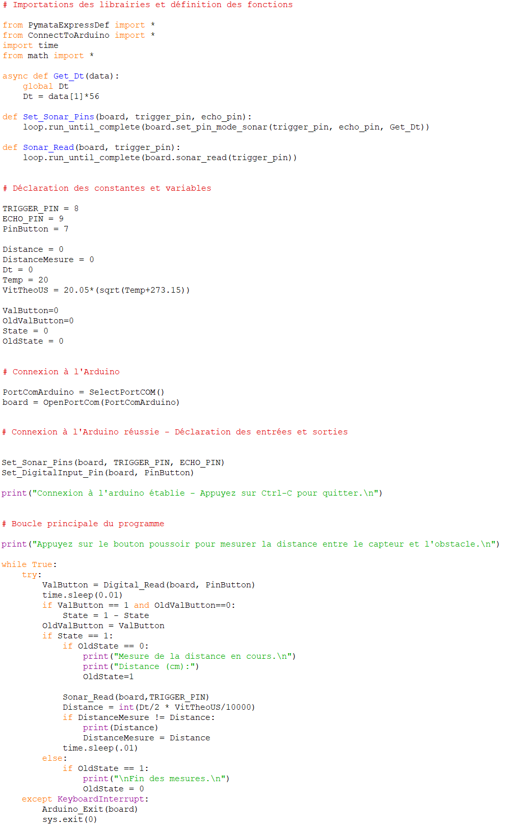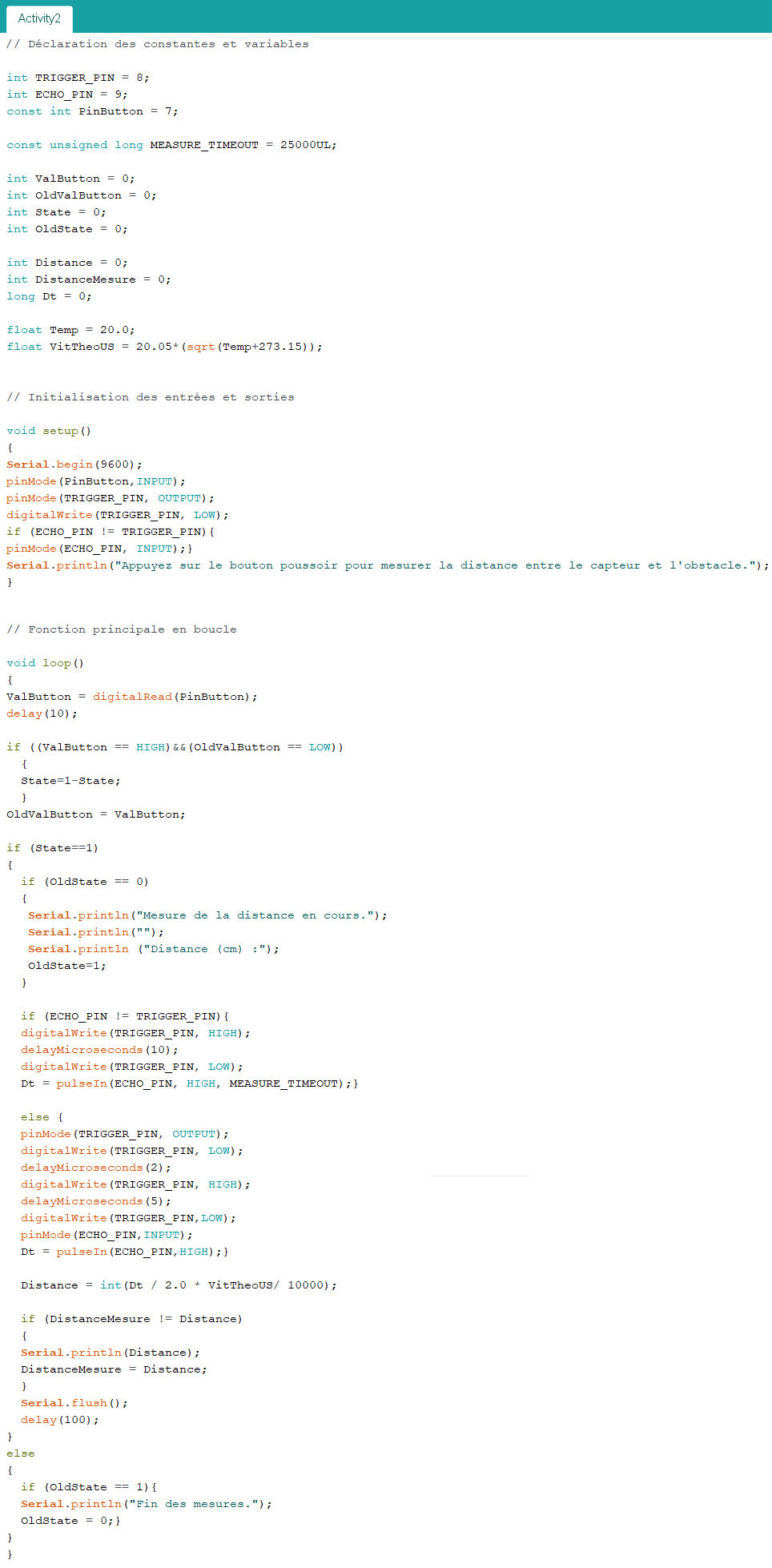 Comme pour l’activité précédente, le programme ci-dessous est adapté pour un capteur ultrasonique à deux broches différentes pour l’émission et la réception des ultrasons.