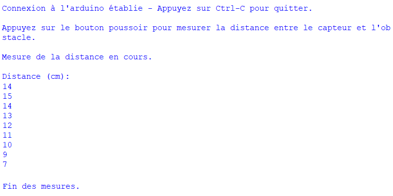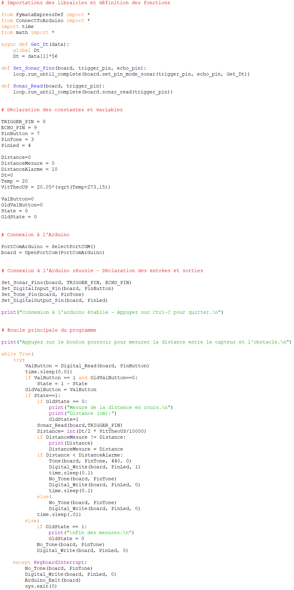 Comme pour l’activité précédente, le programme ci-dessous est adapté pour un capteur ultrasonique à deux broches différentes pour l’émission et la réception des ultrasons.