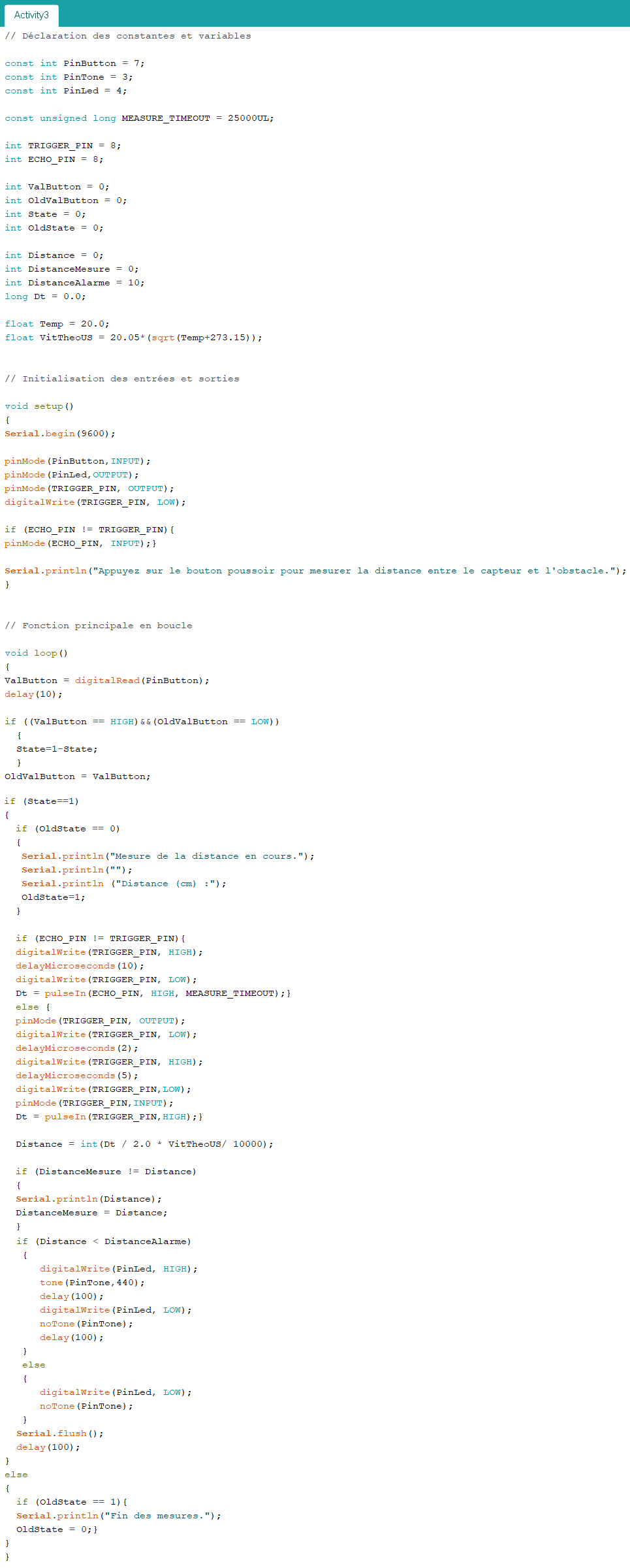 . DistanceAlarme = 10 (constante correspondant à la distance en cm en dessous de laquelle l’alarme est déclenchée)