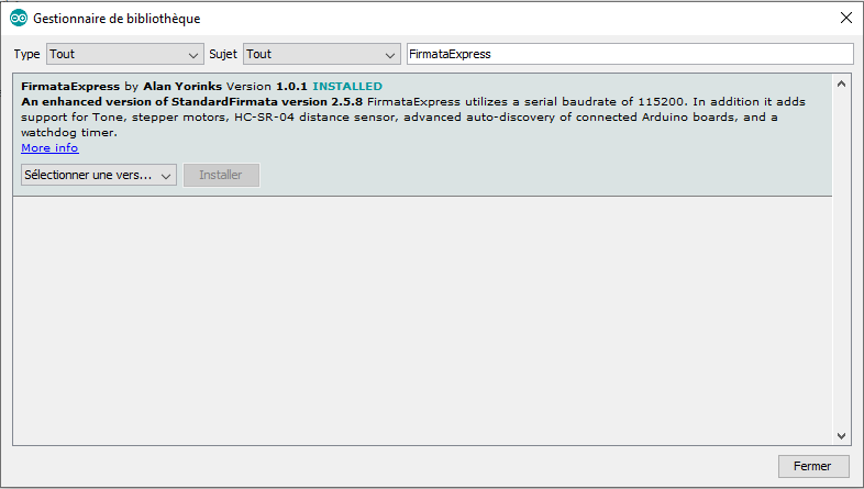 – Entrer ”FirmataExpress” dans la zone de recherche :