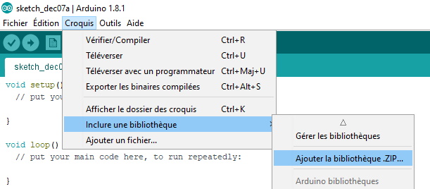 – Sélectionner ”Croquis/Inclure une bibliothèque/Ajouter la bibliothèque .ZIP”,