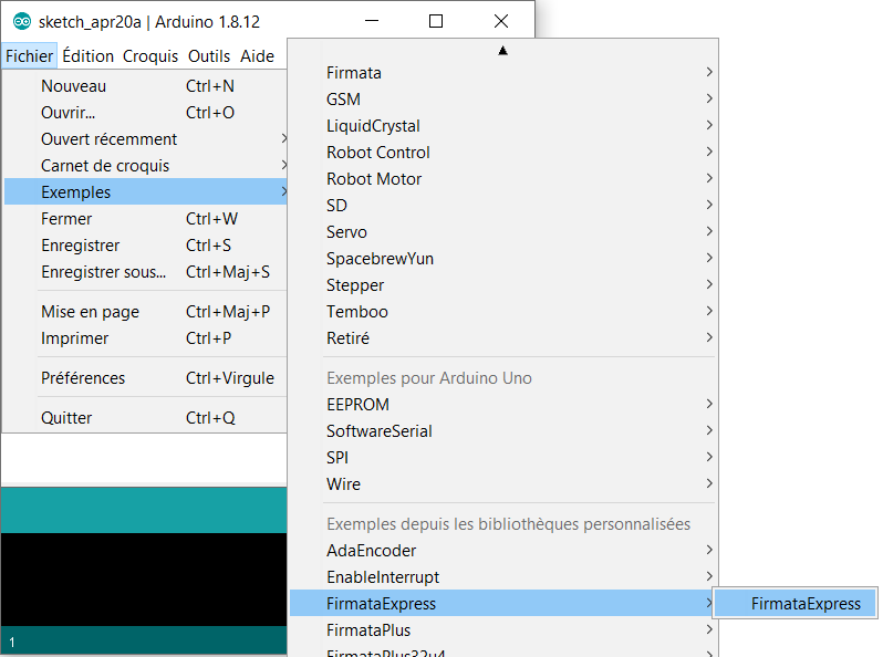 Fichier > Exemples > FirmataExpress > FirmataExpress,